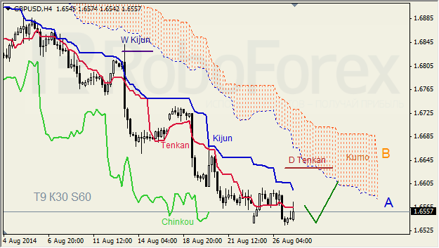 GBP USD, Time Frame H4. Tenkan-Sen and Kijun-Sen are still influenced by “Dead Cross”. Ichimoku Cloud is going down, Chinkou Lagging Span is below the chart, and the price is on Tenkan-Sen. Short‑term forecast: we can expect resistance from Tenkan-Sen, and then a correction towards the cloud’s lower border.