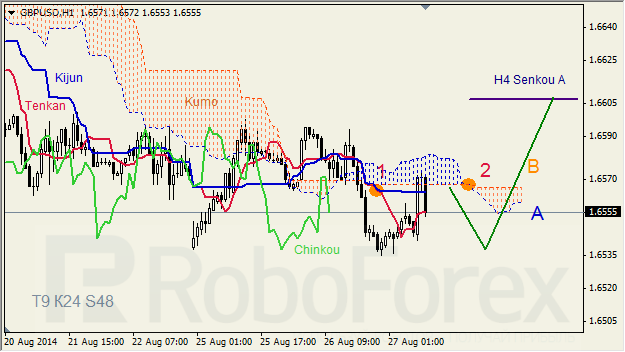 GBP USD, Time Frame H1. Tenkan-Sen and Kijun-Sen formed “Dead Cross” below Kumo (1). Ichimoku Cloud is going down (2), and Chinkou Lagging Span is below the chart. Short‑term forecast: we can expect resistance from Kijun-Sen – Senkou Span B, and attempts of the price to stay below the cloud.