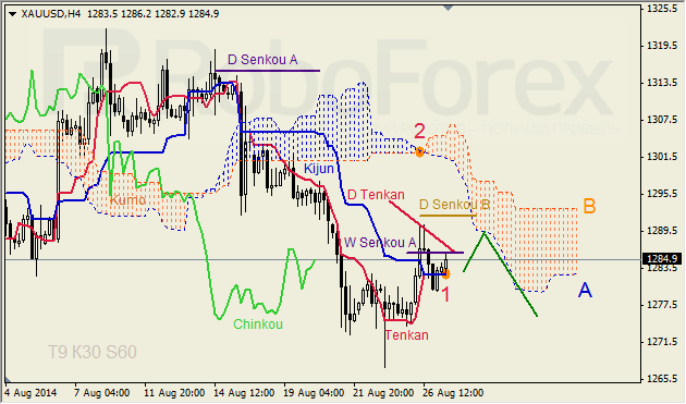 XAU USD, Time Frame H4. Tenkan-Sen and Kijun-Sen are very close to each other below Kumo (1); D Tenkan‑Sen is moving downwards. Ichimoku Cloud is going down (2), Chinkou Lagging Span is below the chart, and the price is on W Senkou Span A, below Kumo. Short-term forecast: we can expect an ascending correction towards the cloud’s lower border to continue.