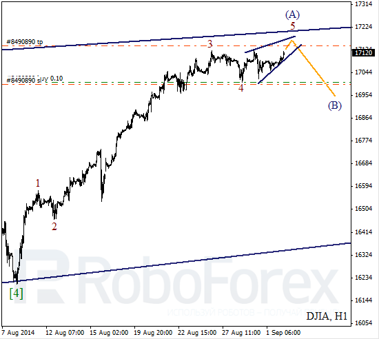 Index is still forming diagonal triangle pattern inside wave 5 of (A). Earlier, the rice completed a long extension inside the third wave. Possibly, during the day the market may reach a new high and then start a new correction.