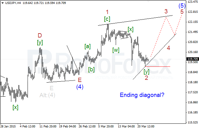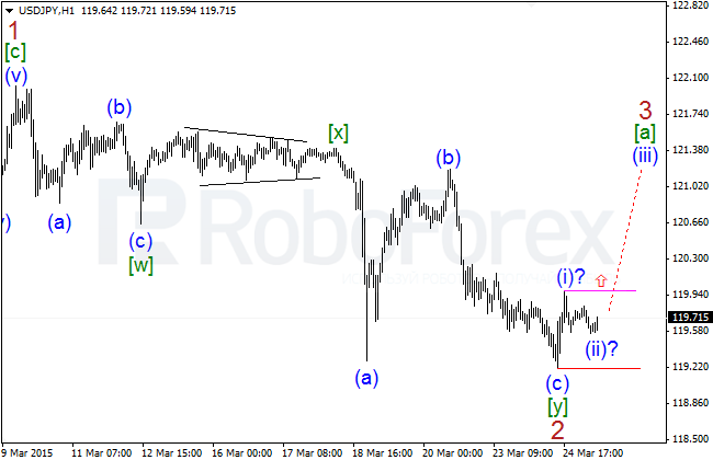 Wave 2 of (5) of [5] of a possible diagonal triangle has taken the form of double zigzag [w]-[x]-[y]. In the nearest future, the market will start forming an ascending zigzag [a]-[b]-[c] inside wave 3 of (5) of [5].