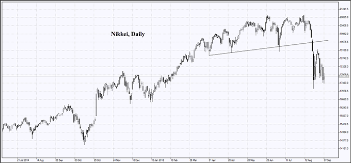 The Nikkei Index grew slightly today after the slump on Friday. The slight weakening of the Yen, which caused the shares growth of the carmakers Toyota Motor and Honda Motor by 1.2%, has contributed to that. Moreover, Toshiba has finally released the accounts for the last financial year and its shares advanced 1.8% on this news. The Nippon Kayaku shares shot up by 12% on the report on the planned certification of its new cure for cancer. In Japan at 1:50 the important macroeconomic data, that is trade balance and the current account in July, the final 2nd quarter GDP and the other data is to be released on Tuesday morning.