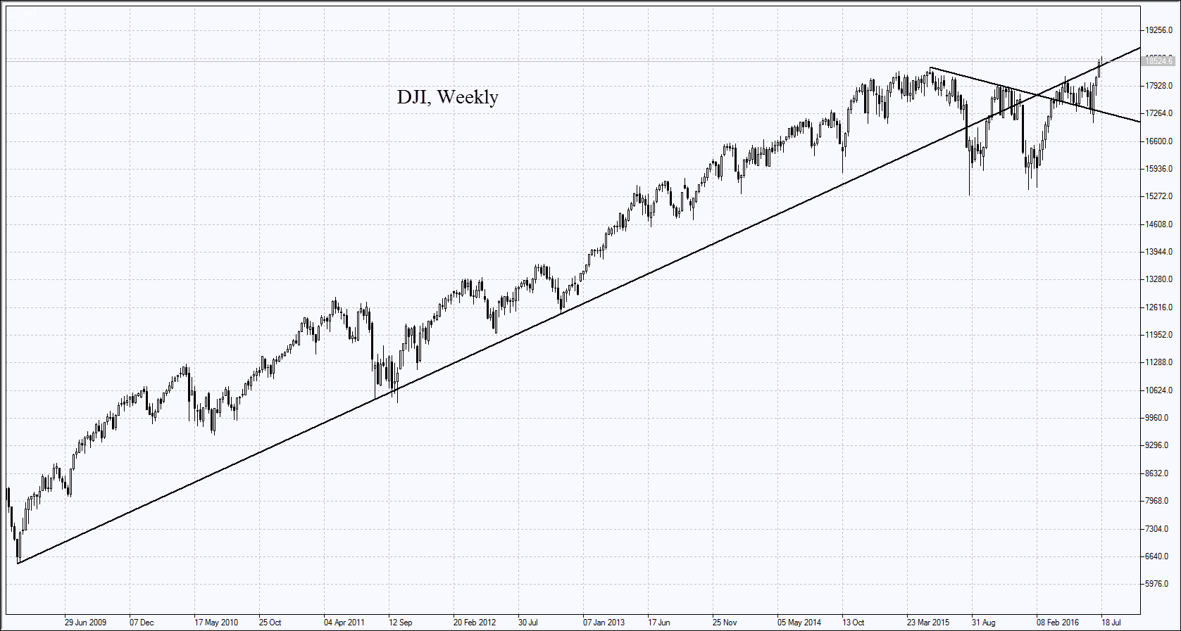 US stock prices and the US dollar index fell on Thursday. This happened because of various market news. Macroeconomic data in the United States were positive, but not enough important for markets. In particular, the weekly unemployment rate decreased slightly and the existing home sales rose in June. Yesterday’s drop in the US stock market indexes was the result of weak quarterly report and forecasts of Southwest Airlines (its stock prices dropped by 11,2%), Union Pacific (-3,4%) and Intel (-4%) companies. This week, the S&P 500 has once again renewed its historical high. Investors think that the quarterly decline in total earnings of the companies included in it will be minus 3,3% compared with the 2nd quarter of 2015. In early June, the estimate was worse and reached minus 4,5%, and even earlier – minus 5%.Today, futures on the US market stock indexes rose despite of Starbuck’s weak report published on Thursday after the completion of trades.Yesterday, the US dollar showed weakening against the major currencies after the Bank of Japan and the ECB announced that they are not planning an immediate mitigation of monetary policy. Today, the American currency strengthened and won back almost all its losses as the British pound declined. The June PMI in Britain fell below 50 pips, and the composite index has been minimal since 2009. This will increase the probability of rate cuts of the Bank of England at the next meeting on August 4. Today, at 15:45 CET, similar to British, the July industrial PMI will be released in the United States.