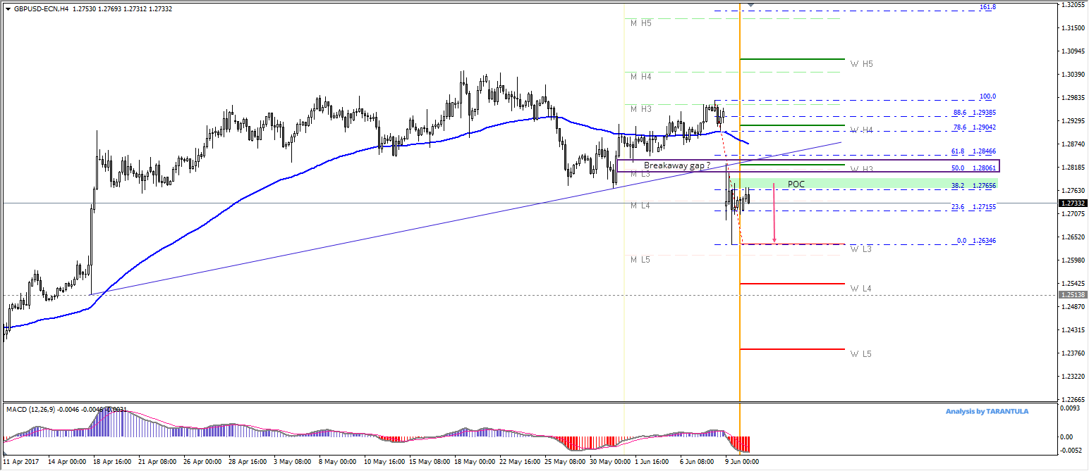The gap has been formed around W H3/ M H3 pivot extending to W L3 support. The POC zone is 1.2765-85 (38.2, double top, historical sellers) and on rallies the price could drop from the zone too. First target is 1.2715 and if momentum persists we could see 1.2634. Have in mind that breakaway gap is tricky and that we might not even see the close of the gap before W H3 -1.2820 is again broken to the upside.