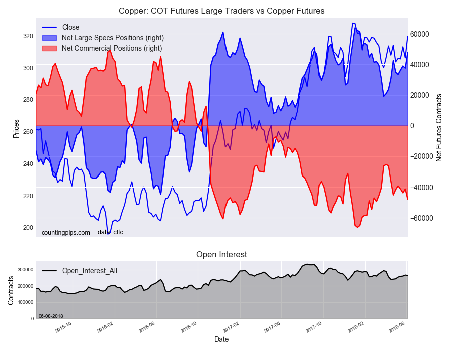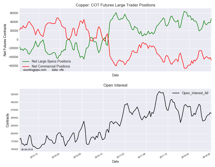 The non-commercial futures contracts of Copper futures, traded by large speculators and hedge funds, totaled a net position of 47,707 contracts in the data reported through Tuesday June 5th. This was a weekly lift of 10,107 contracts from the previous week which had a total of 37,600 net contracts.