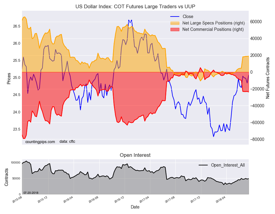Speculators continued to raise bets for the US dollar index this week by 239 contracts to a total net position of 18,924 contracts. The spec position has now improved for thirteen straight weeks and to a new high bullish level since June 13th 2017 when the net positions totaled 28,025 contracts.
