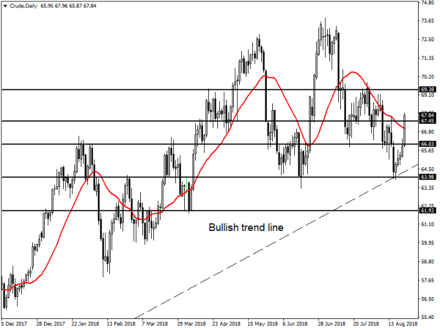 Looking at oil though from a technical point of view it’s clear to see that the trend line has support the bullish resurgence and oil is now pushing upwards to resistance at 69.38. On the next day trading candle I would look for a bounce here at 67.45 on the support level. But for now it looks like oil is going to continue to strengthen higher if the USD weakness continues.