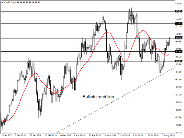 From a technical perspective 69.38 is the hard resistance level stopping any further movements higher. However, above this 71.47 and 73.29 are likely to be other levels that traders will look to target. On the flip side support can be found at 67.45 and 66.03, but I would primarily be focused on the bullish trend line which has propped up the oil market in recent times on bearish moves.