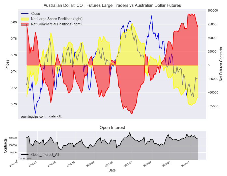 The large speculator positions in Australian dollar futures reached a net position of -59,180 contracts last week in the data ending Tuesday. This was a weekly rise of 600 contracts from the previous week which had a total of -59,780 net contracts.