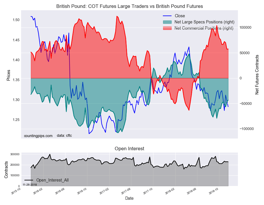 The large British pound sterling speculator level reached a net position of -43,478 contracts in the data reported for last week. This was a weekly gain of 3,629 contracts from the previous week which had a total of -47,107 net contracts.