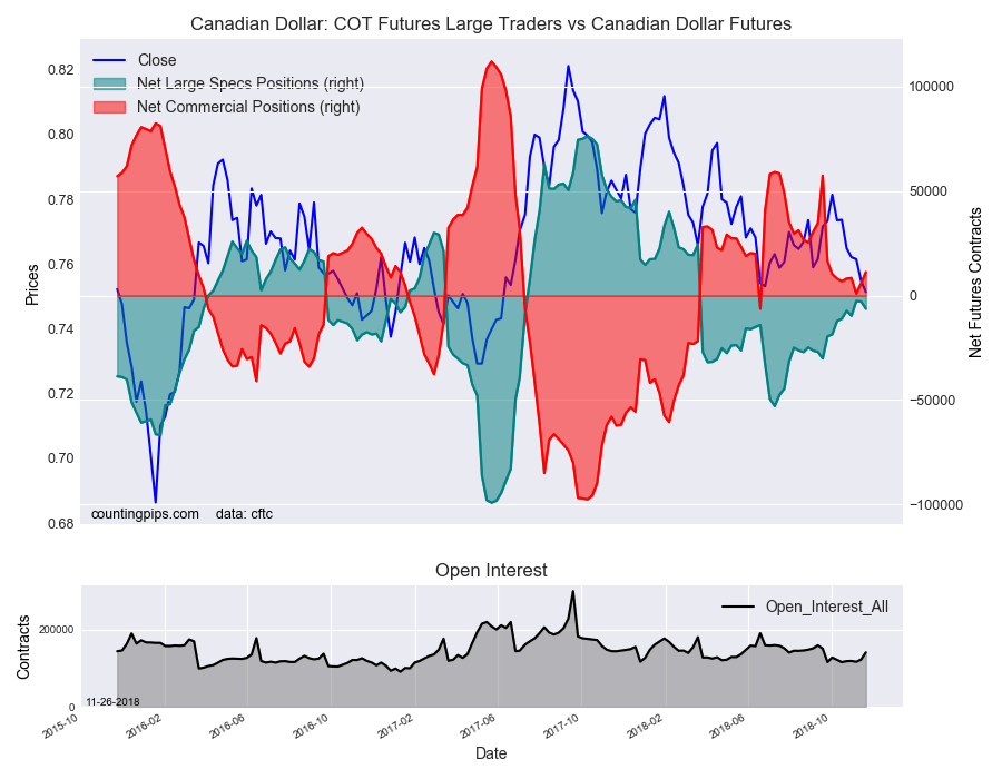 Canadian dollar speculators came in at a net position of -6,289 contracts last week. This was a reduction of -3,498 contracts from the previous week which had a total of -2,791 net contracts.