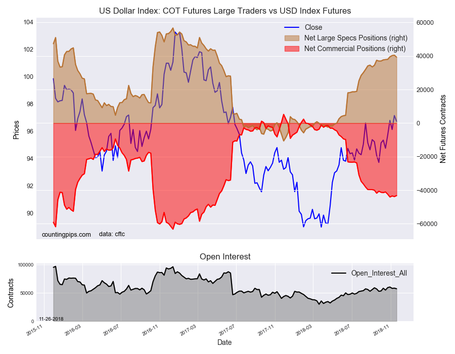 The non-commercial futures contracts of US Dollar Index futures, traded by large speculators and hedge funds, totaled a net position of 39,340 contracts in the data reported through Tuesday November 20th. This was a weekly reduction of -1,173 contracts from the previous week which had a total of 40,513 net contracts.