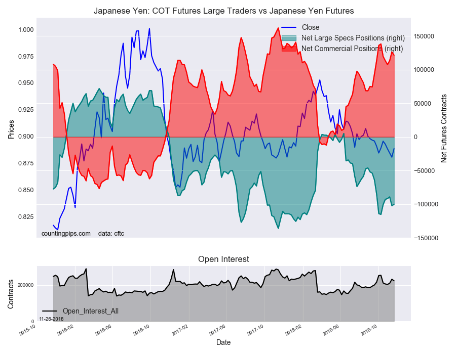 Large Japanese yen speculators equaled a net position of -100,065 contracts in last week’s data. This was a weekly advance of 2,229 contracts from the previous week which had a total of -102,294 net contracts.