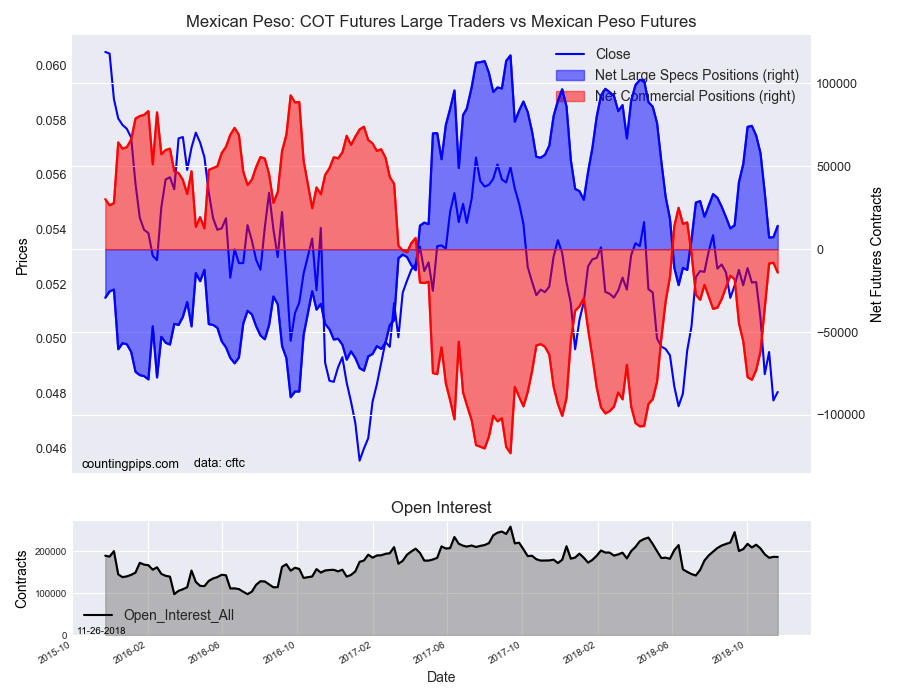 Overall, the major currencies that saw improving speculator positions last week were the British pound sterling (3,629 contracts), Japanese yen (2,229 contracts), Australian dollar (600 contracts), New Zealand dollar (1,521 contracts) and the Mexican peso (6,796 contracts).