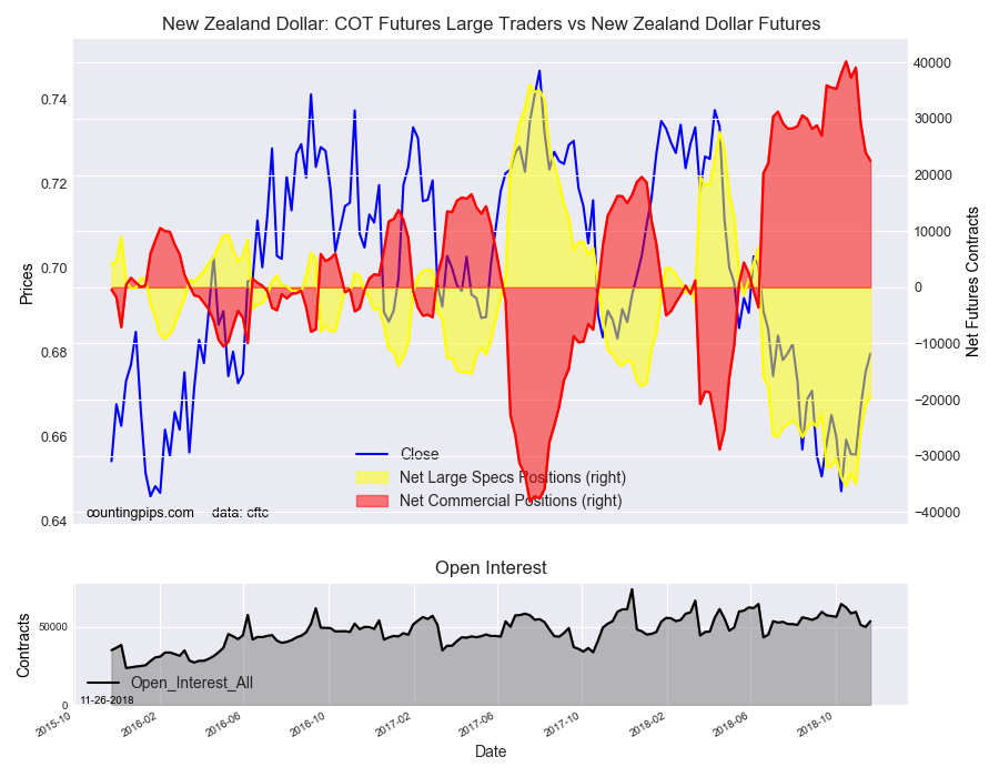 The New Zealand dollar speculative standing resulted in a net position of -19,347 contracts last week in the latest COT data. This was a weekly advance of 1,521 contracts from the previous week which had a total of -20,868 net contracts.