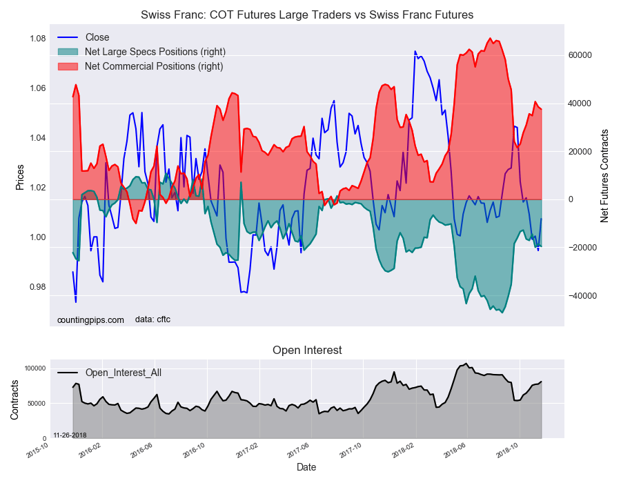 The Swiss franc speculator standing last week was a net position of -19,625 contracts in the data through Tuesday. This was a weekly fall of -1,023 contracts from the previous week which had a total of -18,602 net contracts.
