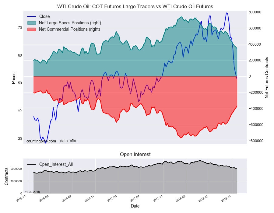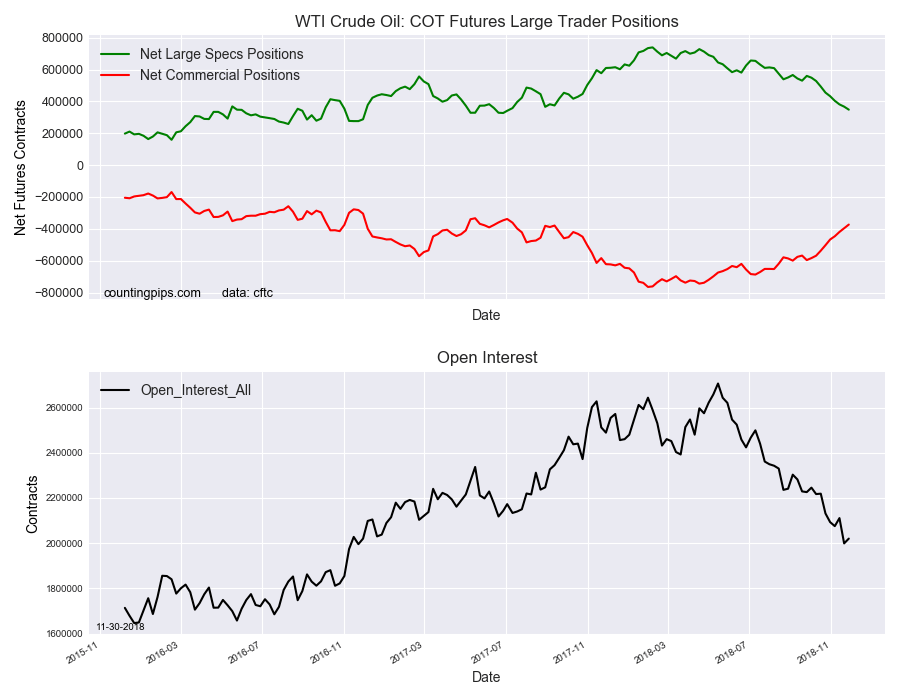 The non-commercial futures contracts of WTI Crude Oil futures, traded by large speculators and hedge funds, totaled a net position of 348,121 contracts in the data reported through Tuesday November 27th. This was a weekly reduction of -19,066 net contracts from the previous week which had a total of 367,187 net contracts.