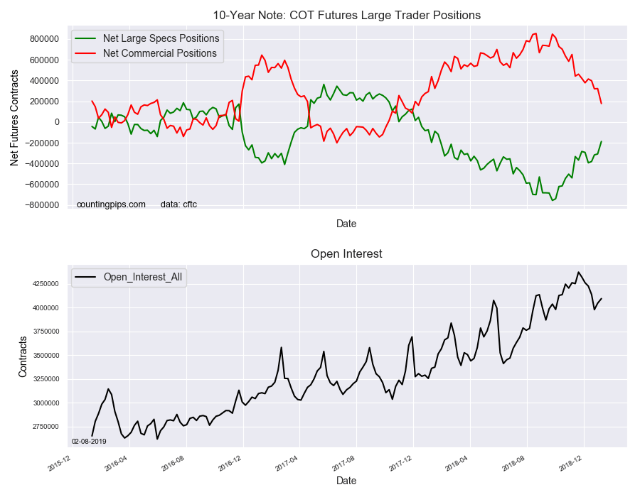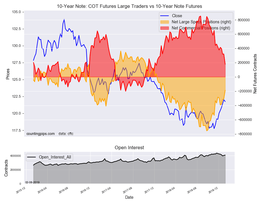 The non-commercial futures contracts of 10-Year Note futures, traded by large speculators and hedge funds, totaled a net position of -188,068 contracts in the data reported through Tuesday January 8th. This was a weekly increase of 120,219 net contracts from the previous week which had a total of -308,287 net contracts.
