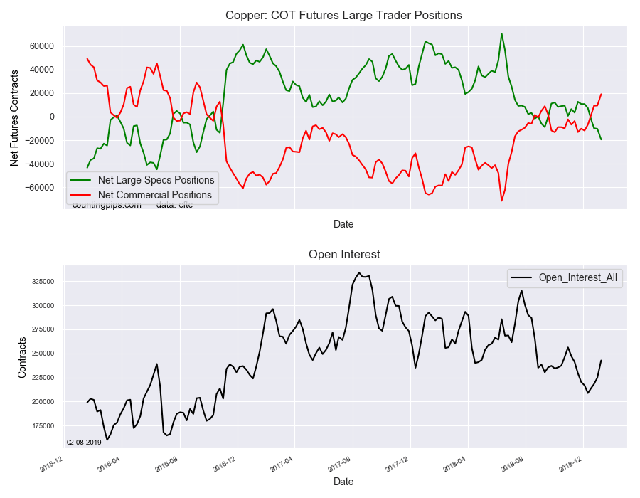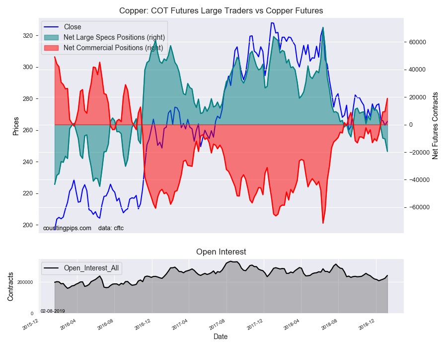 The non-commercial futures contracts of Copper futures, traded by large speculators and hedge funds, totaled a net position of -19,452 contracts in the data reported through Tuesday January 8th. This was a weekly reduction of -9,104 net contracts from the previous week which had a total of -10,348 net contracts.