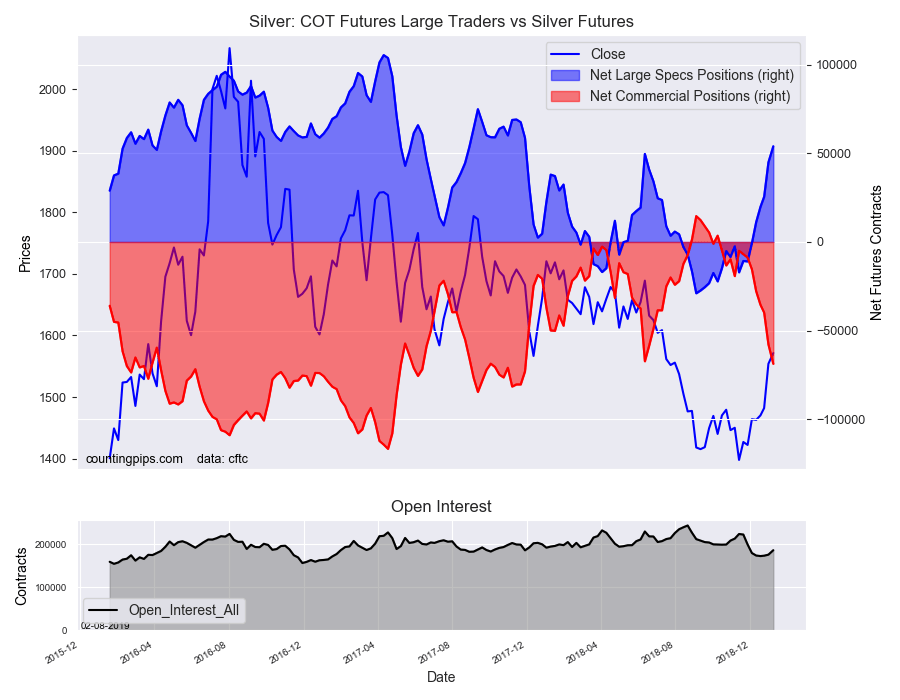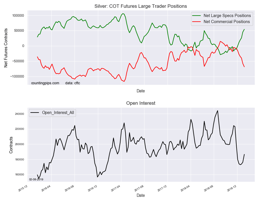 The non-commercial futures contracts of Silver futures, traded by large speculators and hedge funds, totaled a net position of 54,023 contracts in the data reported through Tuesday January 8th. This was a weekly gain of 9,064 net contracts from the previous week which had a total of 44,959 net contracts.