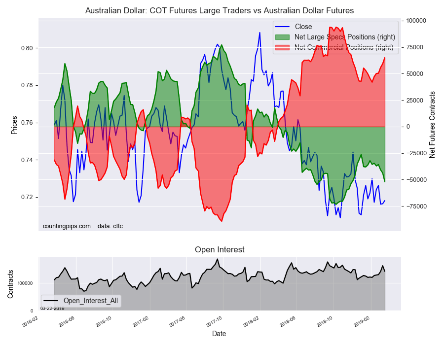 The large speculator positions in Australian dollar futures recorded a net position of -51,902 contracts this week in the data ending Tuesday. This was a weekly decrease of -8,203 contracts from the previous week which had a total of -43,699 net contracts.