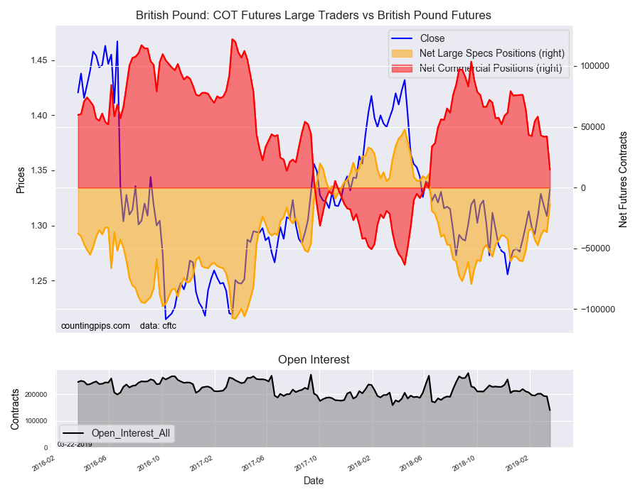 The large British pound sterling speculator level was a net position of -13,774 contracts in the data reported this week. This was a weekly boost of 22,922 contracts from the previous week which had a total of -36,696 net contracts.