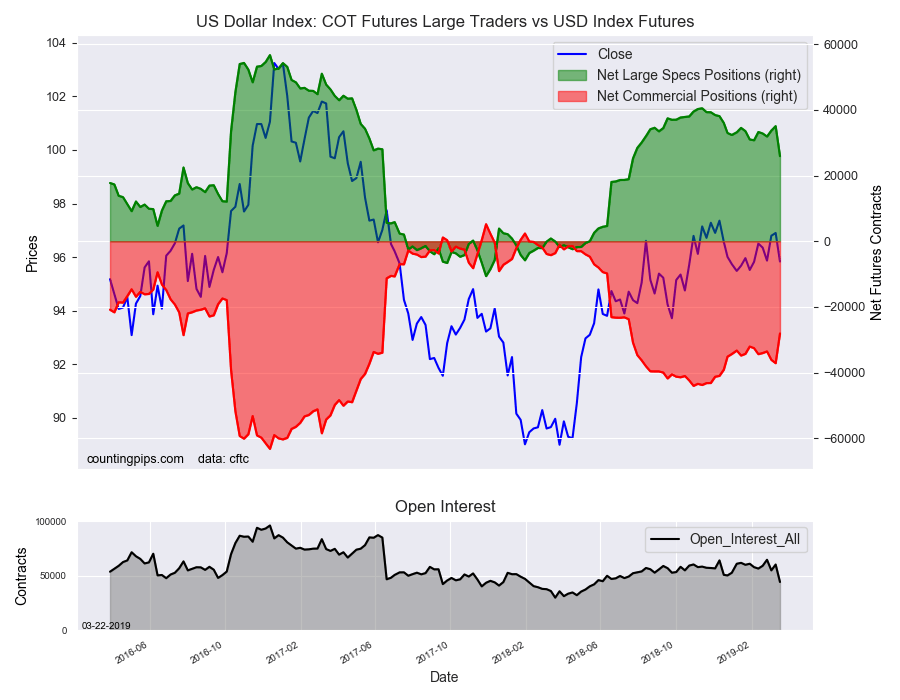The non-commercial futures contracts of US Dollar Index futures, traded by large speculators and hedge funds, totaled a net position of 25,935 contracts in the data reported through Tuesday March 19th. This was a weekly lowering of -9,139 contracts from the previous week which had a total of 35,074 net contracts.
