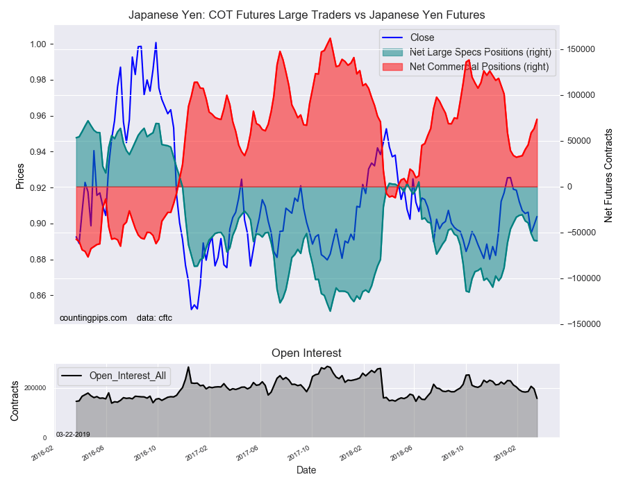 Large Japanese yen speculators equaled a net position of -59,221 contracts in this week’s data. This was a weekly decline of -440 contracts from the previous week which had a total of -58,781 net contracts.