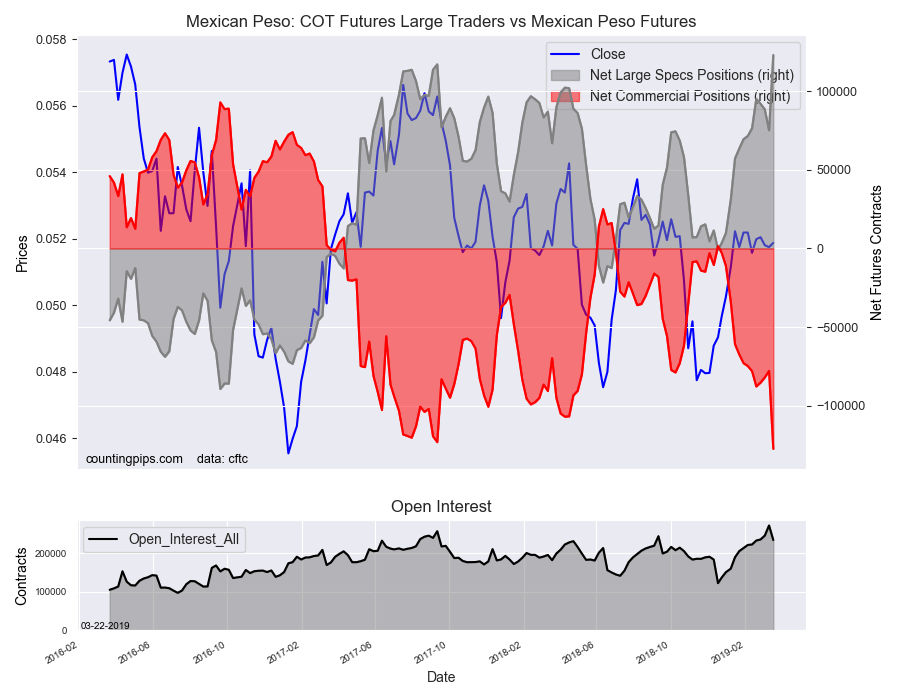 Mexican peso bets jumped dramatically this week by over +47,000 contracts. This weekly gain followed three weeks of declining net positions in MXN futures. The boost this week pushed the total net position for the peso above +122,000 contracts which is by far and away the most bullish level among all the currencies we cover. The last time the MXN position was above +100,000 contracts was April 17th of 2018.