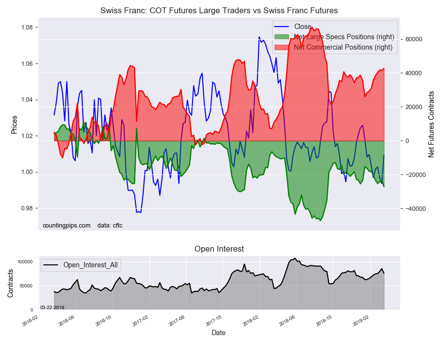 The Swiss franc speculator standing this week totaled a net position of -27,189 contracts in the data through Tuesday. This was a weekly reduction of -3,884 contracts from the previous week which had a total of -23,305 net contracts.
