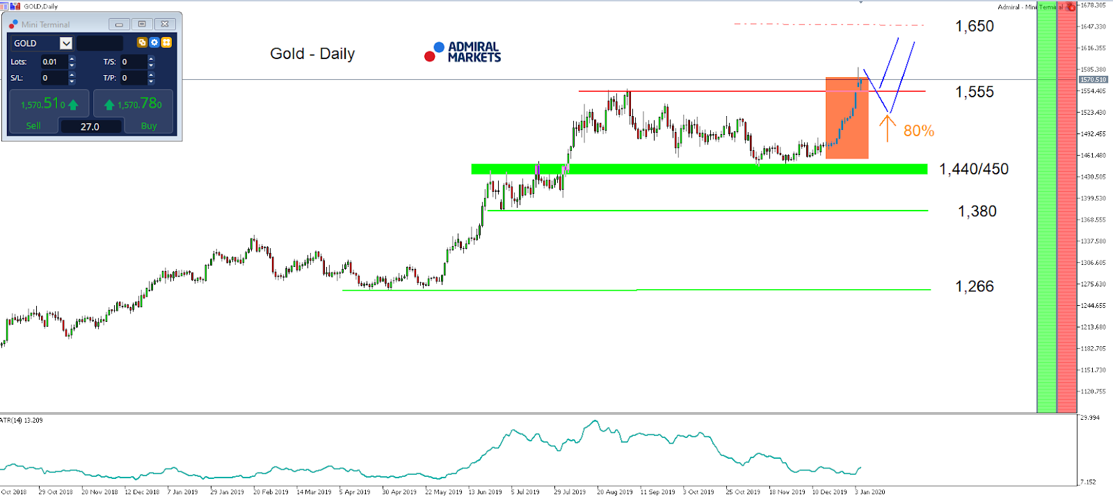 Gold with a very bullish start into 2020 – 1,650/700 USD as target activated