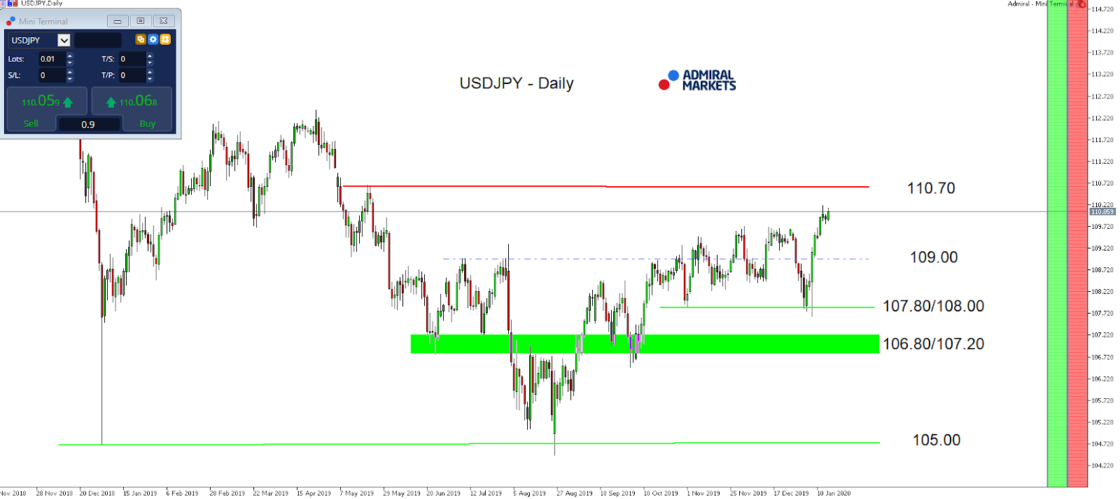 Source: Admiral Markets MT5 with MT5SE Add-on USD/JPY Daily chart (between November 6, 2018, to January 16, 2020). Accessed: January 16, 2020, at 10:00pm GMT – Please note: Past performance is not a reliable indicator of future results, or future performance.