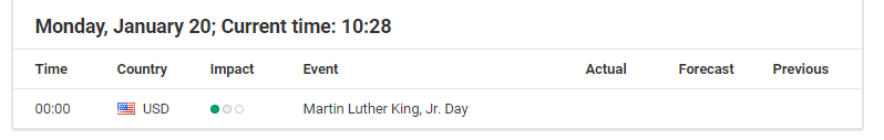 With the US bank holiday Martin Luther King Day (for modified Trading hours, please check our trading schedule), volatility in financial markets should be expected to stay low into the start of the week.