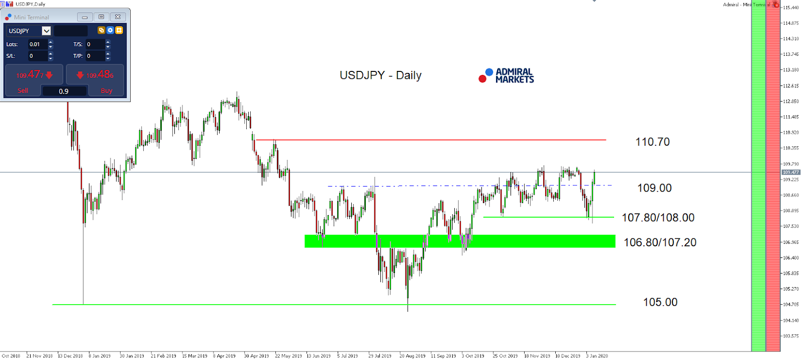 Source: Admiral Markets MT5 with MT5-SE Add-on USD/JPY Daily chart (between October 30, 2018, to January 9, 2020). Accessed: January 9, 2020, at 10:00pm GMT – Please note: Past performance is not a reliable indicator of future results, or future performance.