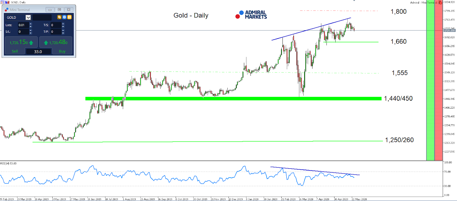 Source: Admiral Markets MT5 with MT5-SE Add-on Gold Daily chart (between February 25, 2019, to May 26, 2020). Accessed: May 26, 2020, at 10:00pm GMT – Please note: Past performance is not a reliable indicator of future results, or future performance.