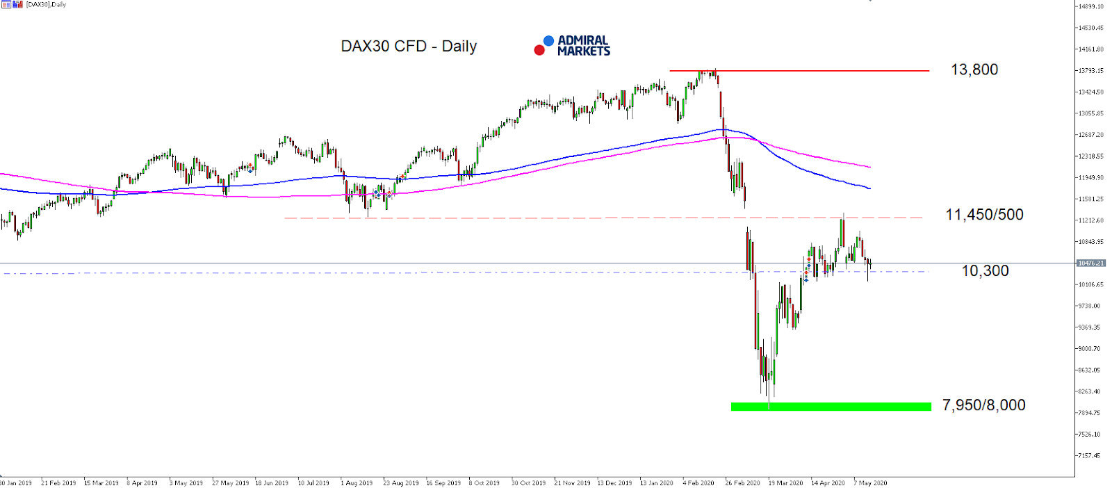 Source: Admiral Markets MT5 with MT5-SE Add-on DAX30 CFD Daily chart (between January 30, 2019, to May 15, 2020). Accessed: May 15, 2020, at 10:00pm GMT – Please note: Past performance is not a reliable indicator of future results, or future performance.