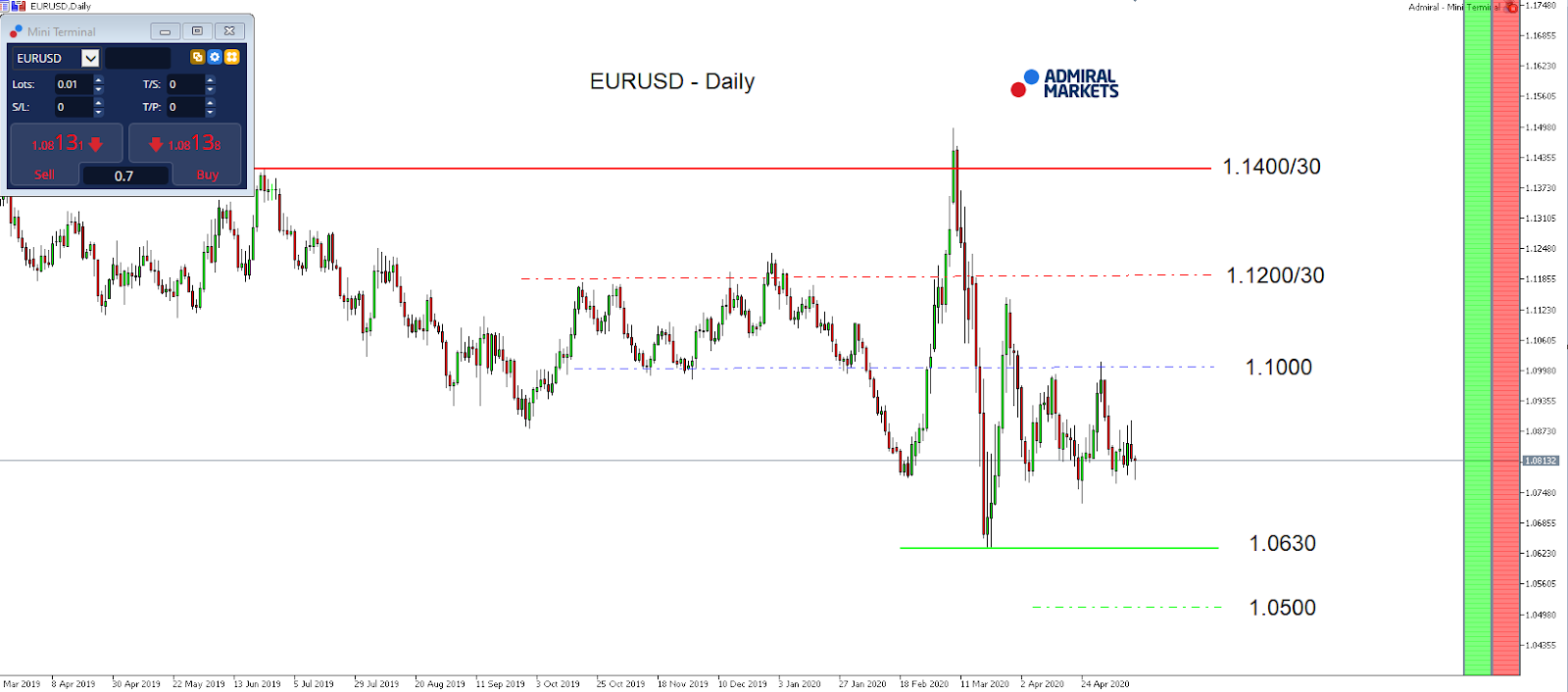 Source: Admiral Markets MT5 with MT5-SE Add-on EUR/USD Daily chart (between March 15, 2019, to May 14, 2020). Accessed: May 14, 2020, at 10:00pm GMT – Please note: Past performance is not a reliable indicator of future results, or future performance.
