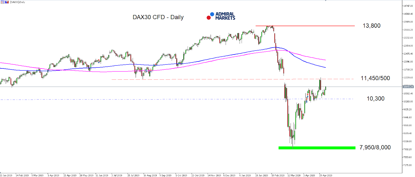 Source: Admiral Markets MT5 with MT5-SE Add-on DAX30 CFD Daily chart (between January 23, 2019, to May 8, 2020). Accessed: May 8, 2020, at 10:00pm GMT – Please note: Past performance is not a reliable indicator of future results, or future performance.