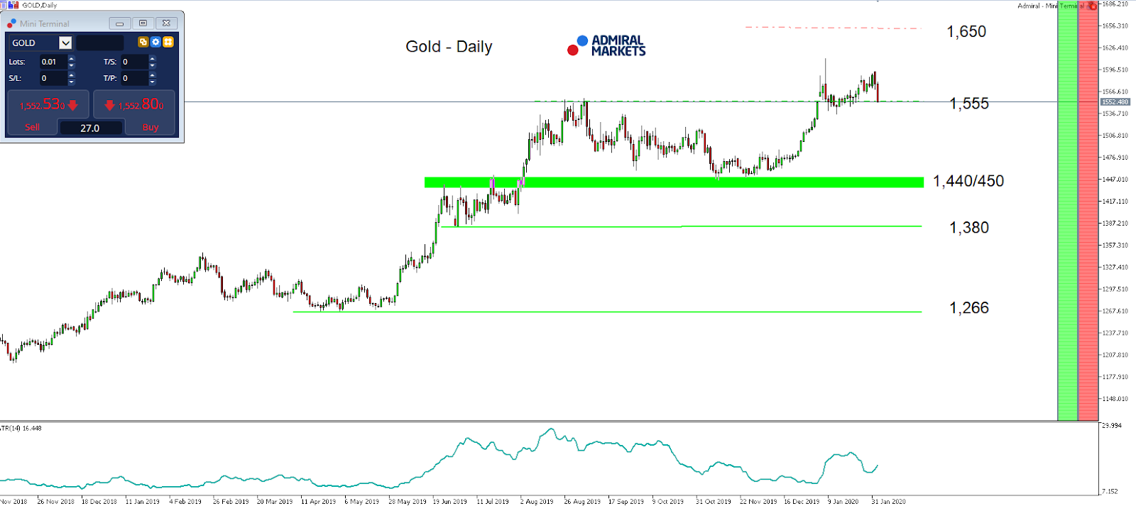 Source: Admiral Markets MT5 with MT5-SE Add-on Gold Daily chart (between November 2, 2018, to February 4, 2020). Accessed: February 4, 2020, at 10:00pm GMT – Please note: Past performance is not a reliable indicator of future results, or future performance.